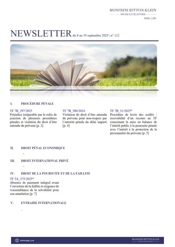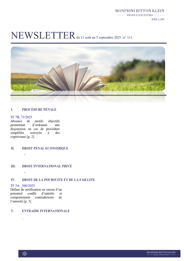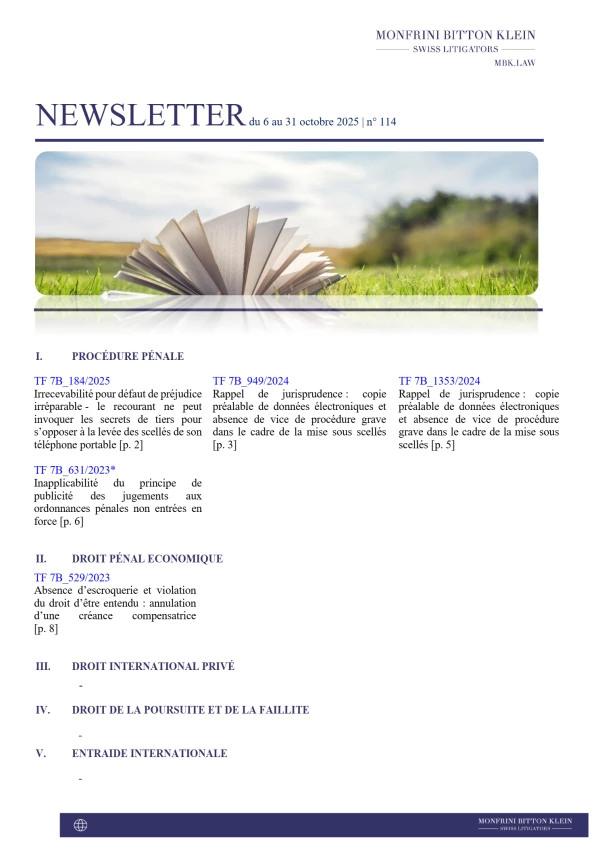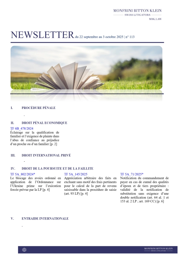 Abonnez-vous à notre newsletter qui offre un tour d’horizon de la jurisprudence rendue par le Tribunal fédéral dans les principaux domaines d’activité de l’Etude, le droit pénal économique et le recouvrement d’actifs.